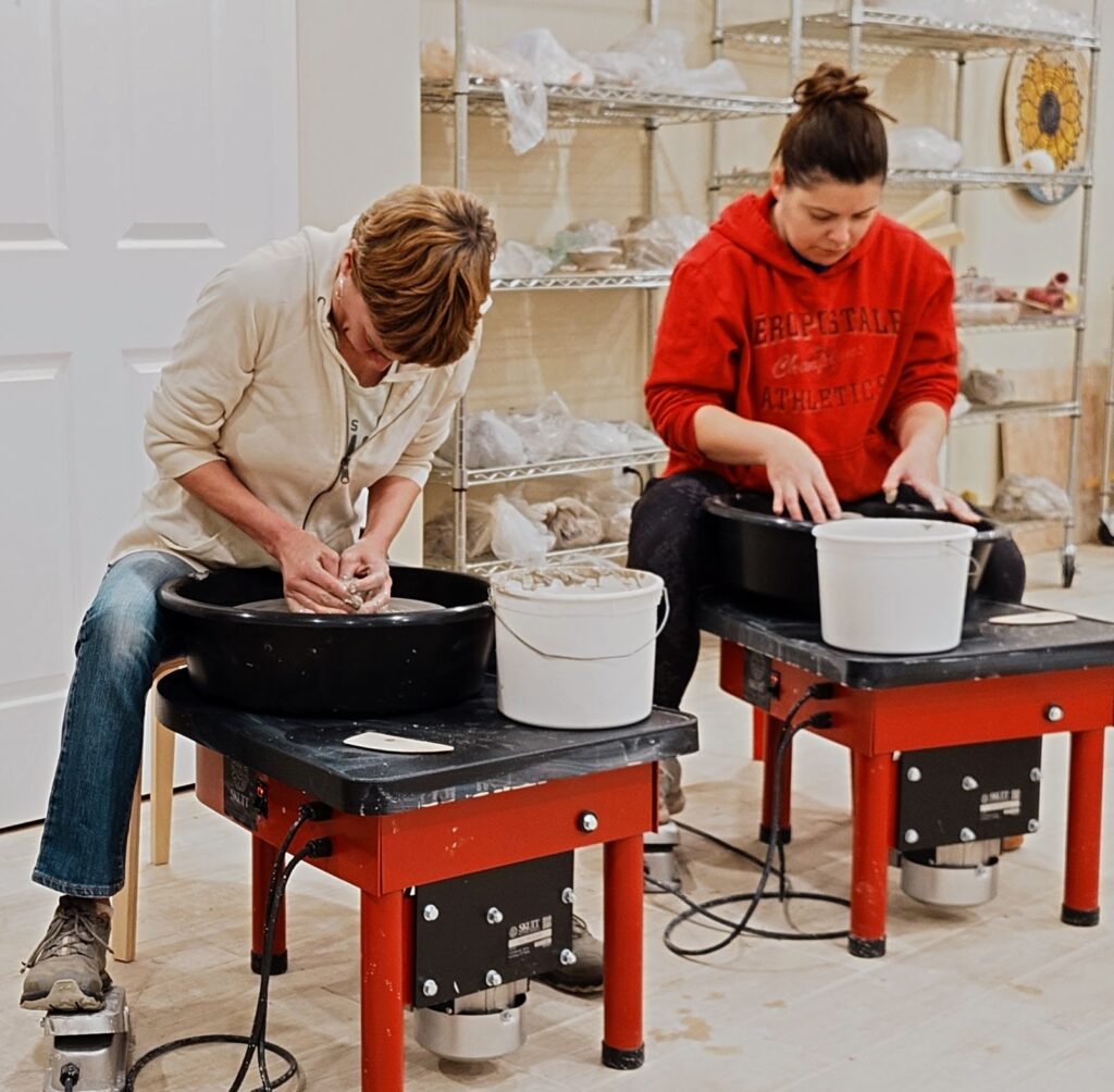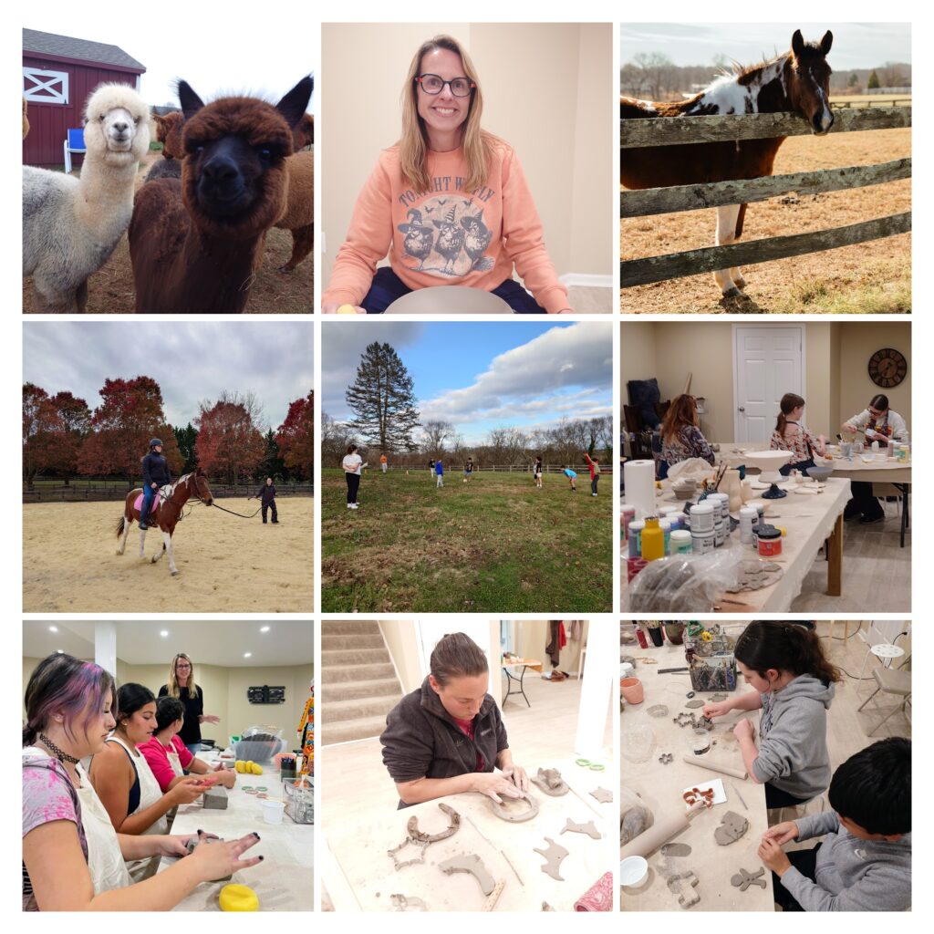 Day of horsemanship, farm visits with alpacas, games, and pottery making in studio.